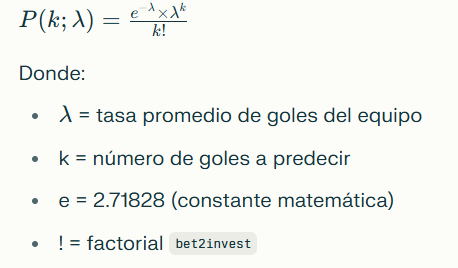 La Distribución de Poisson es un modelo estadístico que predice la probabilidad de que un equipo marque exactamente k goles en un partido, basándose en su promedio de goles ofensivos y defensivos.